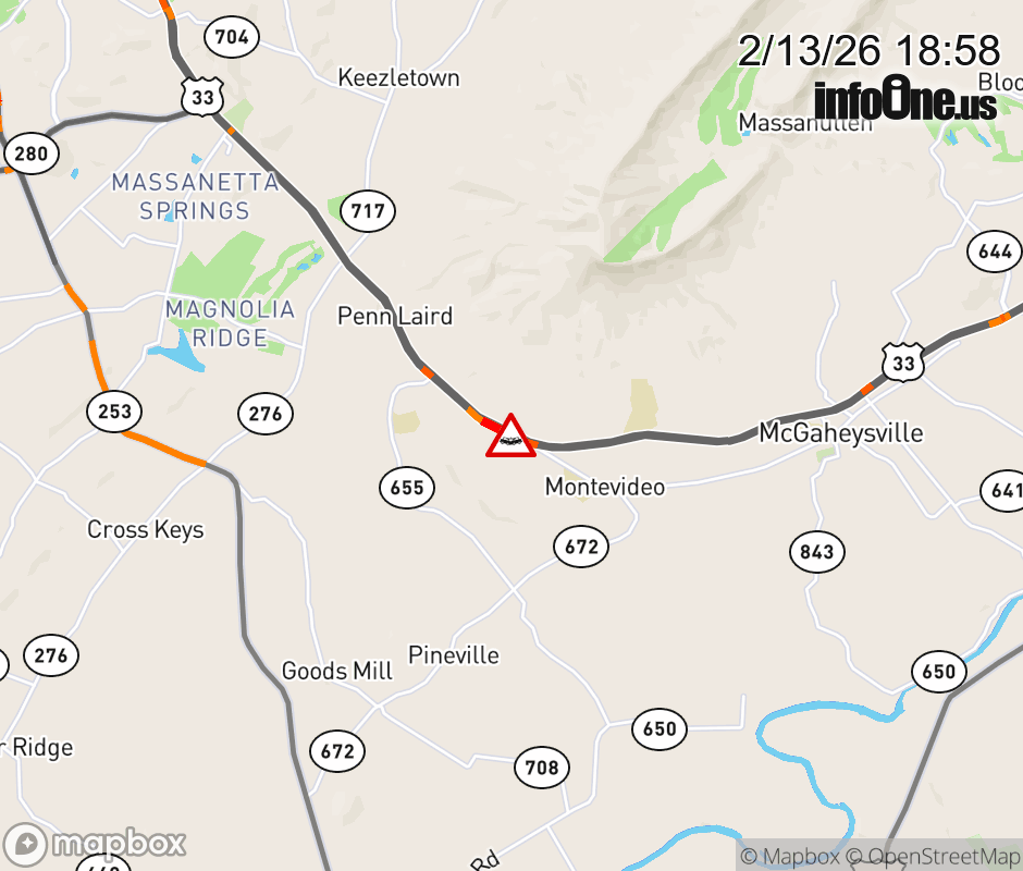 On US-33 in the County of Rockingham, in the vicinity of S Montevideo Cir; Rt. 654E/W (Rockingham County), motorists can expect delays due to a vehicle crash. The east right lane and right shoulder are closed. ![]() |