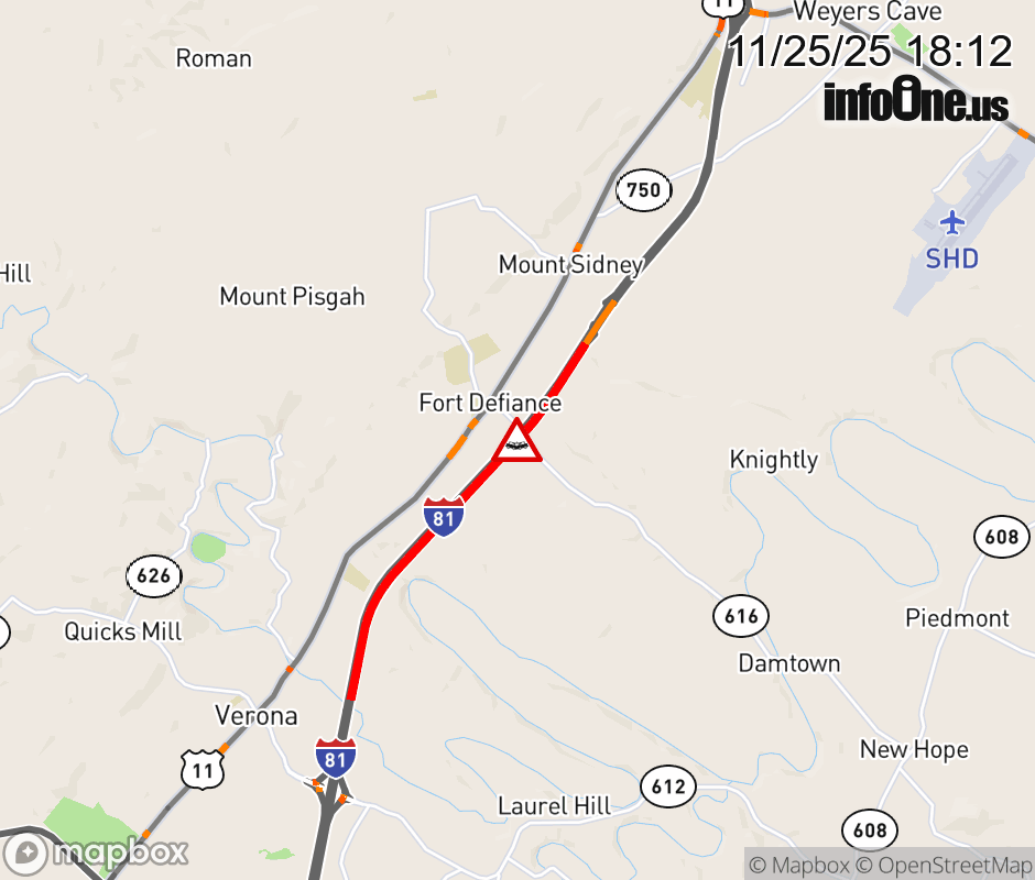 On I-81 at mile marker 231 in the County of Augusta, motorists can expect delays due to a multi-vehicle crash. The north left shoulder and left lane are closed. Traffic backups are approximately 2.5 miles. Updated: Tue 11/25/25 6:12 PM EST ![]() Updated: Tue 11/25/25 6:12 PM EST |