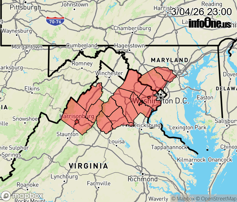 Canceled 3/4/26 11:03 PM Dense Fog Advisory issued March 4 at 10:59PM EST until March 5 at 10:00AM EST by NWS Baltimore MD/Washington DC * WHAT... Visibility one quarter mile or less in dense fog. * WHERE... Portions of central Maryland and northern Virginia, and the north-central Shenandoah Valley. * WHEN... Until 10 AM EST Thursday. * IMPACTS... Low visibility could make driving conditions hazardous. ![]() |
