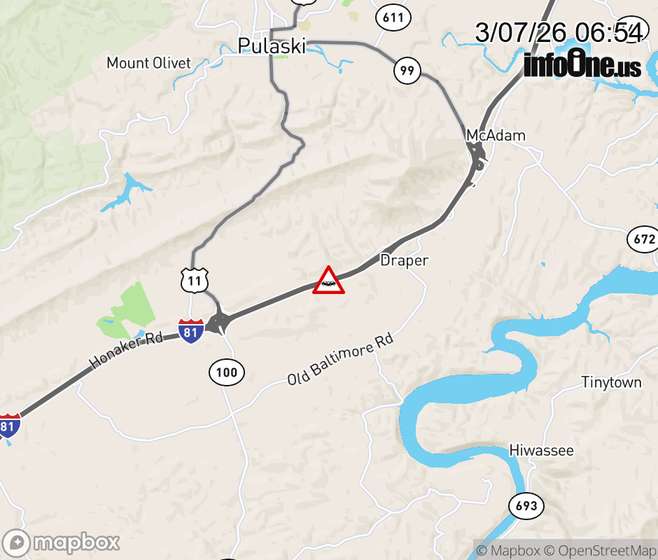 On I-81 at mile marker 91.6 in the County of Pulaski, motorists can expect delays due to a tractor trailer crash. The south left shoulder and left lane are closed. ![]() |