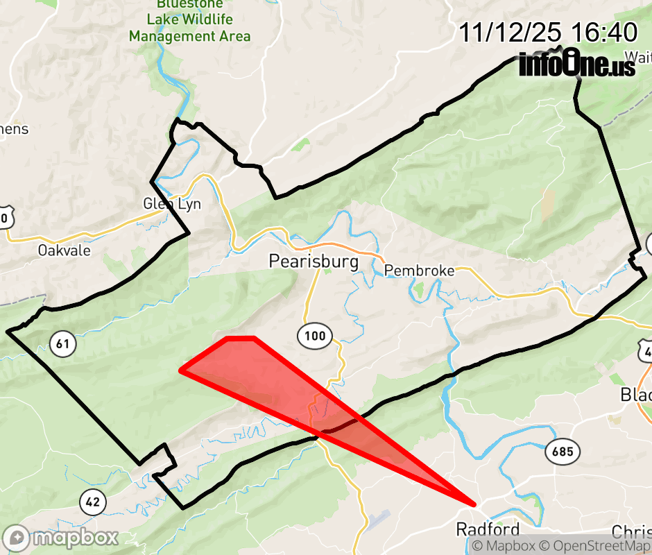 Giles County has 1 power outage affecting 43 customers. Appalachian Power 43 without power Pearisburg: Customers affected: 43 (1%) Estimated repair: Wed 8:00 PM Updated: Wed 11/12/25 3:30 PM EST ![]() Updated: Wed 11/12/25 4:40 PM EST |