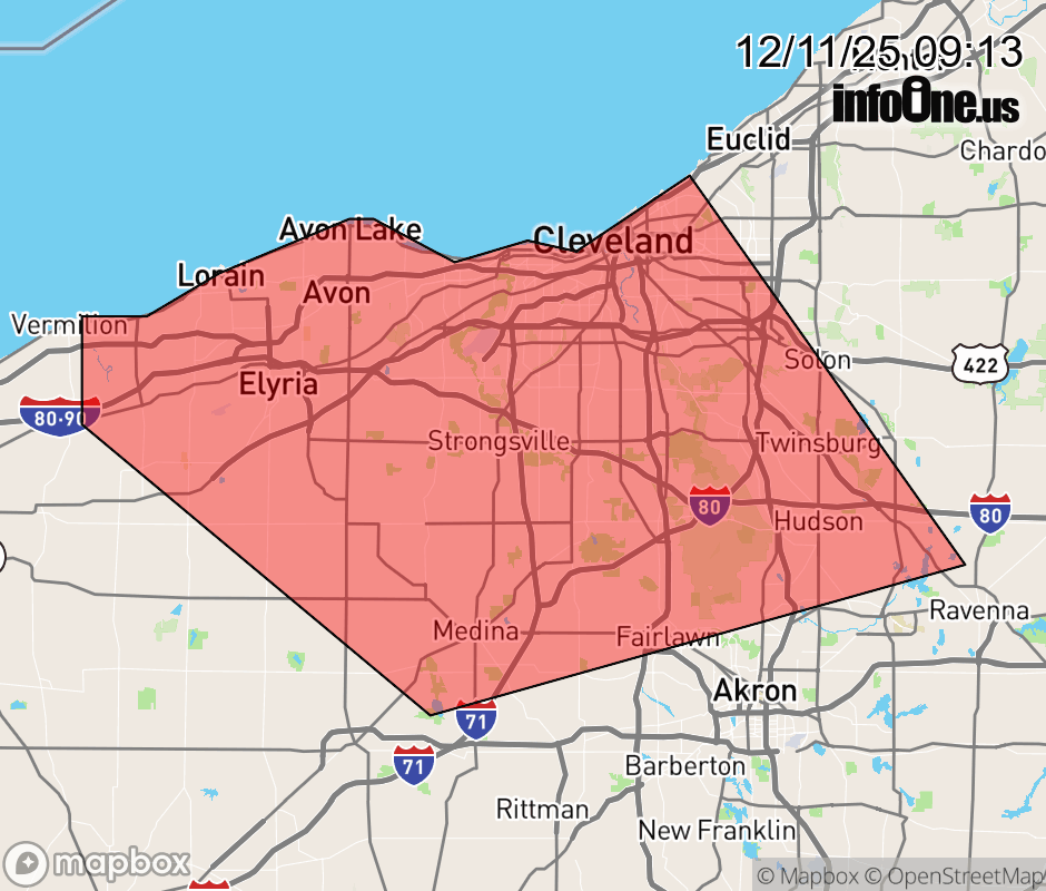 Canceled 12/11/25 10:15 AM Special Weather Statement issued December 11 at 9:12AM EST by NWS Cleveland OH At 911 AM EST, radar indicated an intense lake effect snow band along a line extending from Vermilion to near Parma, moving southeast at 10 mph. HAZARDS INCLUDE... Visibility rapidly dropping to less than a quarter of a mile... Up to one inch of quick snow accumulation... Locations impacted include... Cleveland, Akron, Lorain, Elyria, Medina, Vermilion, Western Vermilion, Parma, Lakewood, Cuyahoga Falls, Cleveland Heights, Strongsville, Brunswick, Westlake, North Royalton, North Ridgeville, Solon, Avon Lake, Hudson, and Twinsburg. Use extra caution if you must travel into or through this lake effect snow band. Rapid changes in visibility and potentially slick roads are likely to lead to accidents. Consider delaying travel until this snow band passes your location. ![]() |