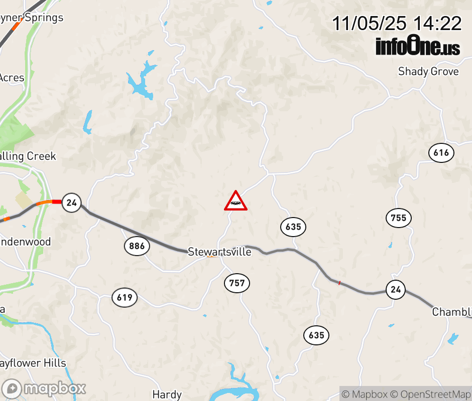 On Rt. 619 in the County of Bedford, in the vicinity of Jeters Mill Rd; Rt. 759N/S (Bedford County), motorists can expect delays due to a vehicle crash. All east lanes are closed. All west lanes are closed. Updated: Wed 11/5/25 2:22 PM EST ![]() Updated: Wed 11/5/25 2:22 PM EST |