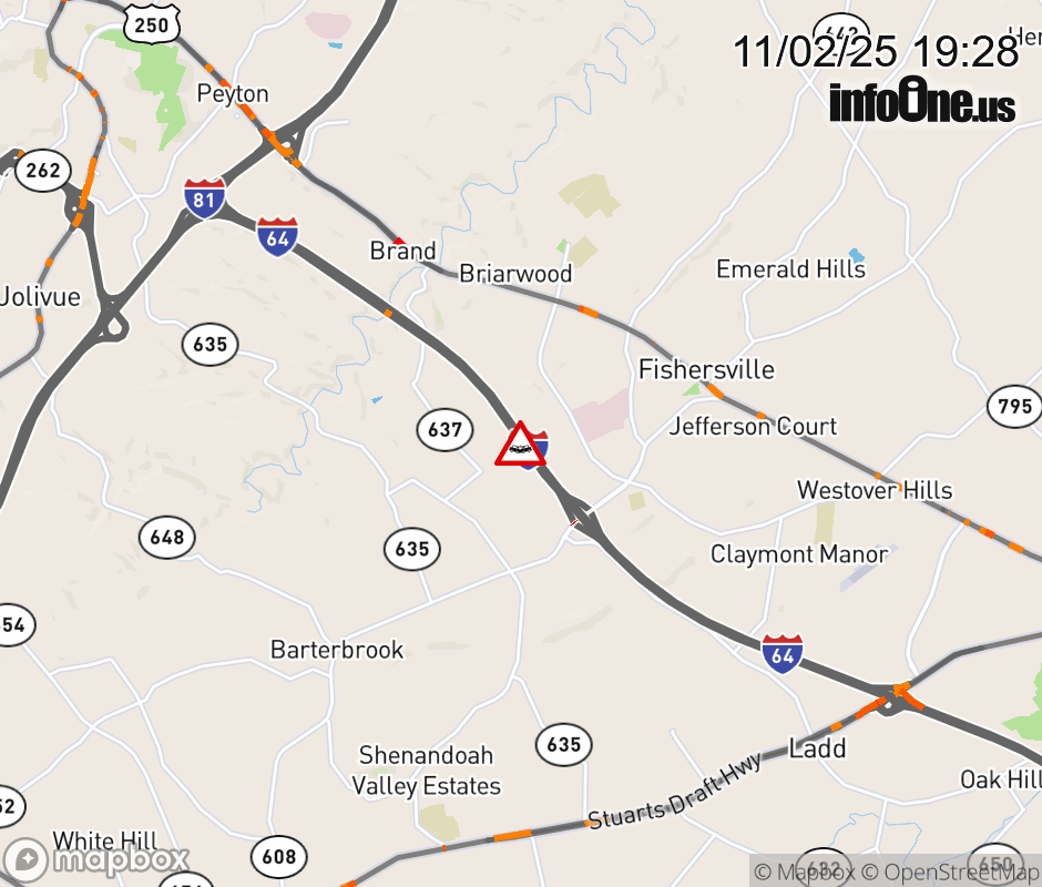 On I-64 at mile marker 90.8 in the County of Augusta, motorists can expect delays due to a vehicle crash. The east right shoulder is closed. Traffic backups are approximately 2.0 miles. Updated: Sun 11/2/25 7:28 PM EST ![]() Updated: Sun 11/2/25 7:28 PM EST |