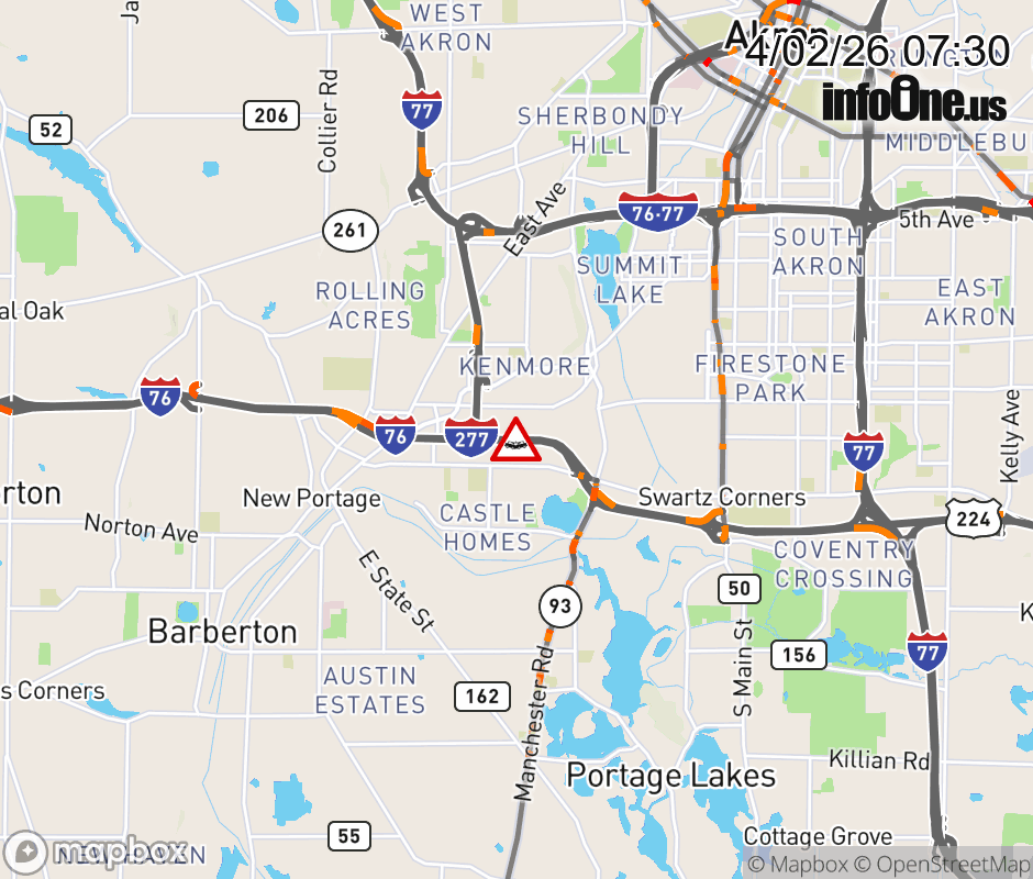 The left lane is blocked on I-277/US-224 West at I-76 East/I-77 North, due to a crash. Updated: Thu 4/2/26 7:30 AM EDT ![]() Updated: Thu 4/2/26 7:30 AM EDT |