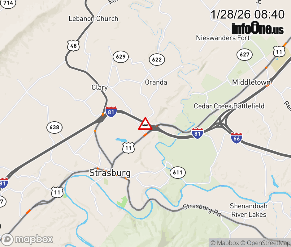 On I-81 at mile marker 298 in the County of Shenandoah, motorists can expect delays due to a tractor trailer crash. The north right shoulder is closed. Updated: Wed 1/28/26 8:40 AM EST ![]() Updated: Wed 1/28/26 8:40 AM EST |