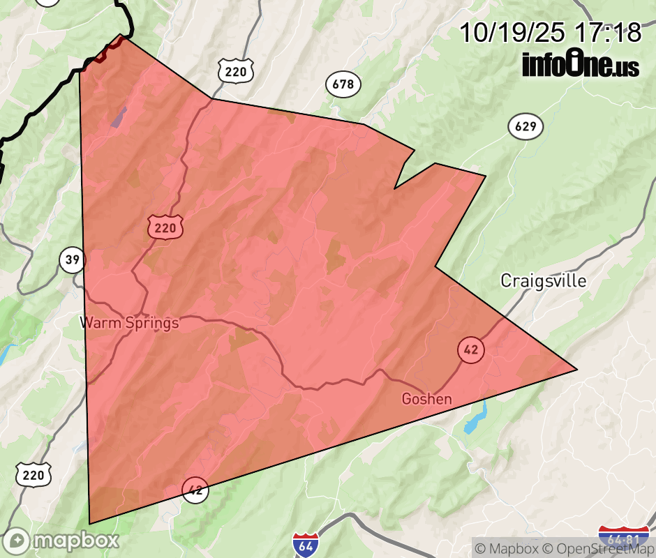 Canceled 10/19/25 5:45 PM Special Weather Statement issued October 19 at 5:14PM EDT by NWS Blacksburg VA At 514 PM EDT, Doppler radar was tracking a cluster of strong thunderstorms over Burnsville, or 9 miles northeast of Warm Springs, moving east at 40 mph. HAZARD...Wind gusts up to 50 mph. SOURCE...Radar indicated. IMPACT...Gusty winds could knock down tree limbs and blow around unsecured objects. Locations impacted include... Goshen... Millboro... Warm Springs... Hot Springs... Nimrod Hall... Douthat State Park... and Bells Valley. ![]() |