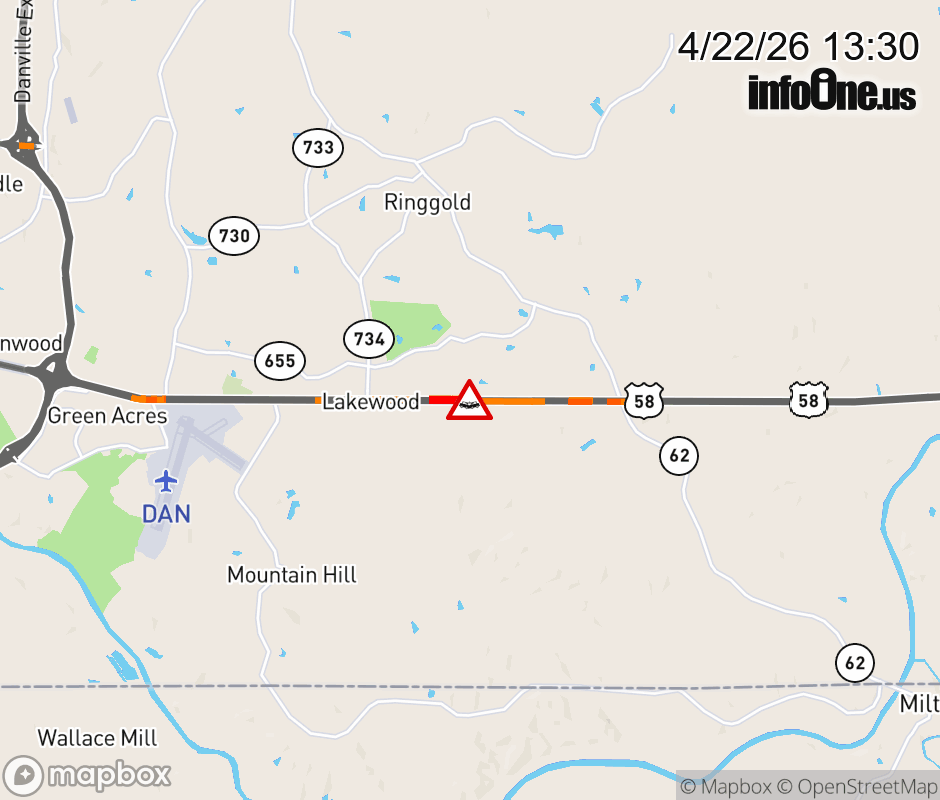 On US-58 West in the County of Pittsylvania, in the vicinity of Staton Dr; Rt. 985N/S (Pittsylvania County), motorists can expect delays due to a vehicle crash. ![]() |
