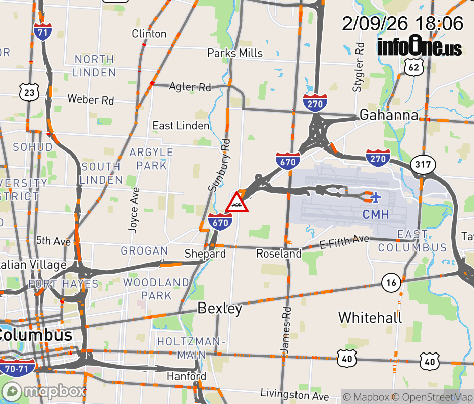 The left shoulder is blocked on I-670/US-62 West beyond Airport/Cassady Ave/Stelzer Rd, due to a disabled vehicle. ![]() |
