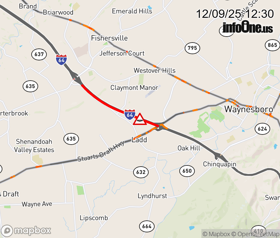 On I-64 East at mile marker 94 in the County of Augusta, motorists can expect delays due to a vehicle crash. Updated: Tue 12/9/25 12:30 PM EST ![]() Updated: Tue 12/9/25 12:30 PM EST |