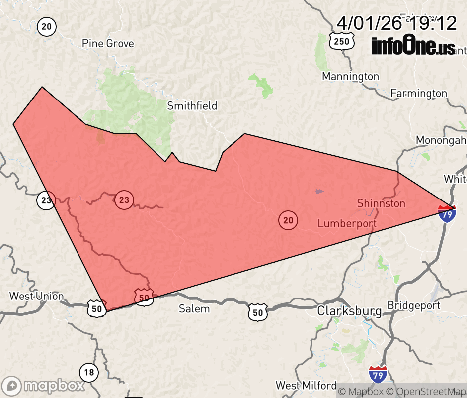 Canceled 4/1/26 7:23 PM Severe Thunderstorm Warning issued April 1 at 7:10PM EDT until April 1 at 7:45PM EDT by NWS Charleston WV SVRRLX The National Weather Service in Charleston West Virginia has issued a * Severe Thunderstorm Warning for... Northeastern Doddridge County in northern West Virginia... East central Tyler County in northern West Virginia... Northern Harrison County in northern West Virginia... * Until 745 PM EDT. * At 709 PM EDT, a severe thunderstorm was located near Salem, or 15 miles west of Clarksburg, moving east at 35 mph. HAZARD...70 mph wind gusts. SOURCE...Radar indicated. Numerous reports of downed trees in Ritchie and Doddridge Counties. IMPACT...Expect considerable tree damage. Damage is likely to mobile homes, roofs, and outbuildings. * Locations impacted include... Shinnston, Lumberport, Enterprise, Wallace, Lima, Center Point, Sedalia, and Canton. This includes Route 50 in West Virginia between mile markers 62 and 63. ![]() |