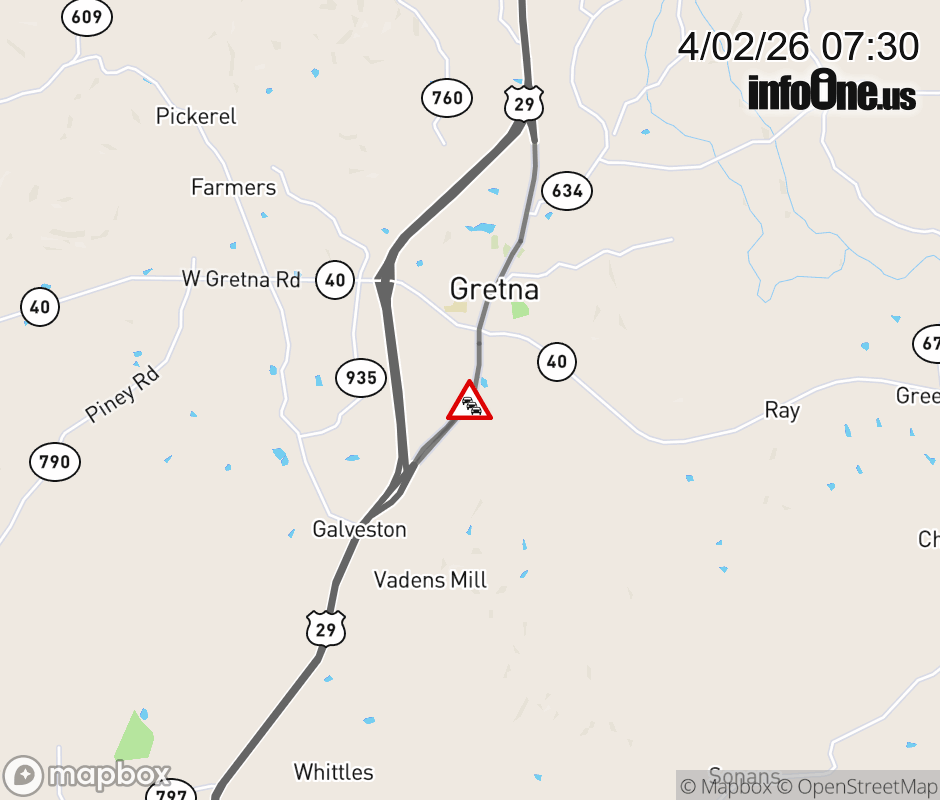 On BUS US-29 South in the County of Pittsylvania, in the vicinity of S Main St; Taylors Mill Rd; U S Highway No 29; BUS US-29N (3 Pittsylvania/Gretna), BUS US-29N, motorists can expect delays due to weather. Lane closures exist. Updated: Thu 4/2/26 7:30 AM EDT ![]() Updated: Thu 4/2/26 7:30 AM EDT |