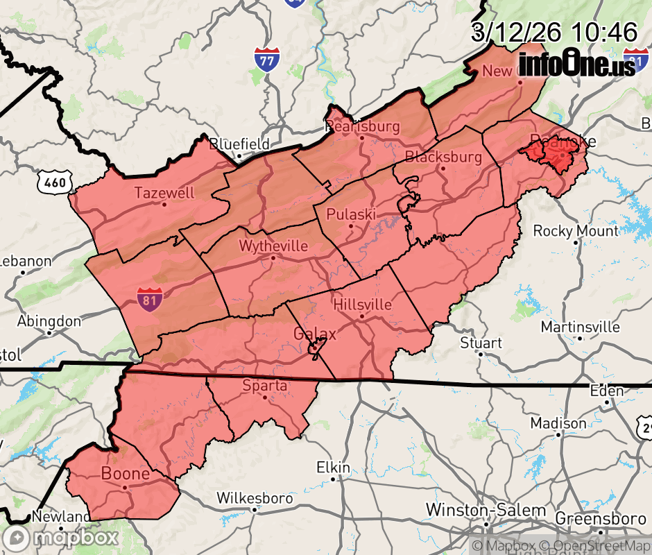 Canceled 3/12/26 1:45 PM Special Weather Statement issued March 12 at 10:44AM EDT by NWS Blacksburg VA Localized heavy snow has lead to accumulating snow of 1 to 2 inches on roadways in counties of the New river Valley and along the Blue Ridge in Floyd, Carroll, and Grayson county. Snowfall should start to diminish in intensity over the next 1 to 2 hours across the area with additional accumulations of up to half an inch possible. Dissruptions to travel may occur until the heavy snow stops. Melting of snow on roadways is expected given warm temperatures that occurred over the last several days. ![]() |