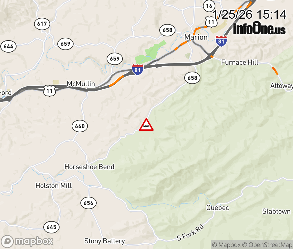 On Rt. 658 North in the County of Smyth, in the vicinity of Reed Hollow Rd; Rt. 786N/S (Smyth County), motorists can expect delays due to a vehicle crash. Updated: Sun 1/25/26 3:14 PM EST ![]() Updated: Sun 1/25/26 3:14 PM EST |