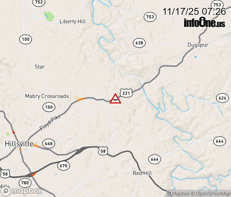 On US-221 North in the County of Carroll, in the vicinity of Pilgrim'S Trl; Rt. 673N/S (Carroll County), motorists can expect delays due to a vehicle crash. Lane closures exist. ![]() |