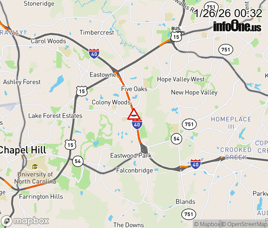 The right lane is closed past Exit 270 (US 15-501). Updated: Mon 1/26/26 12:32 AM EST ![]() Updated: Mon 1/26/26 12:32 AM EST |
