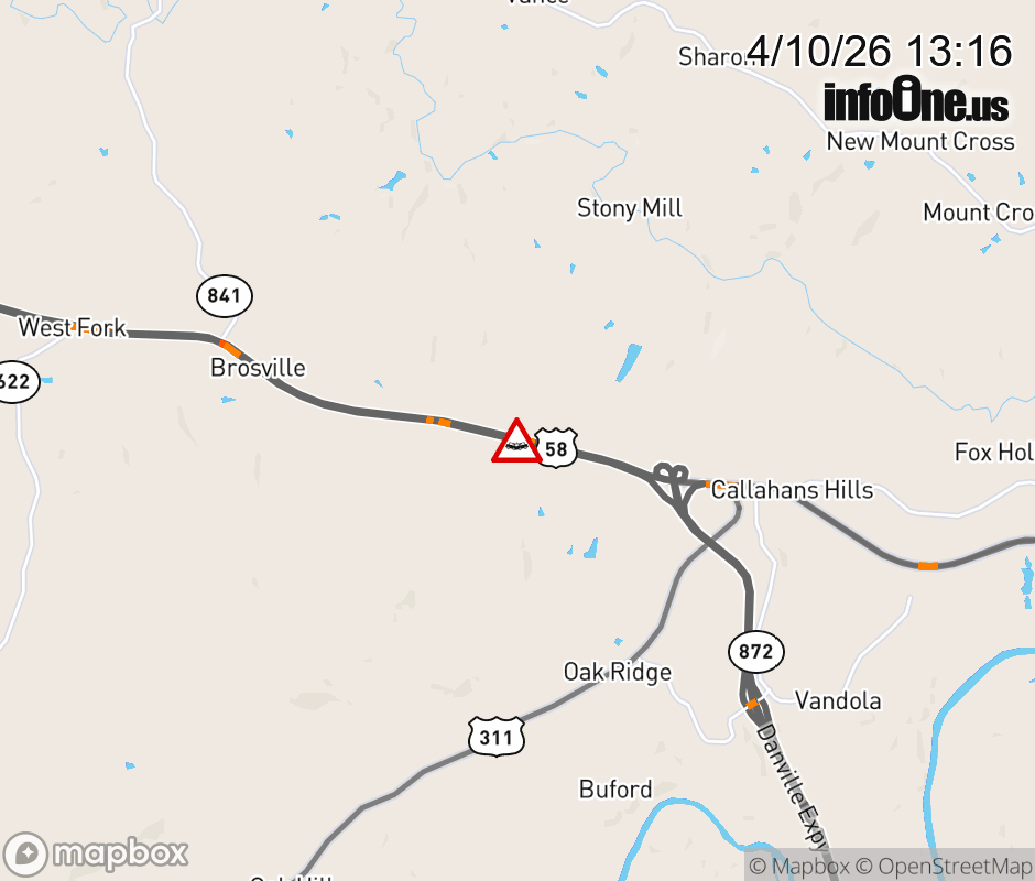 On US-58 in the County of Pittsylvania, in the vicinity of Breezewood Dr; Rt. 869N/S (Pittsylvania County), motorists can expect delays due to a vehicle crash. The west left lane is closed. ![]() |