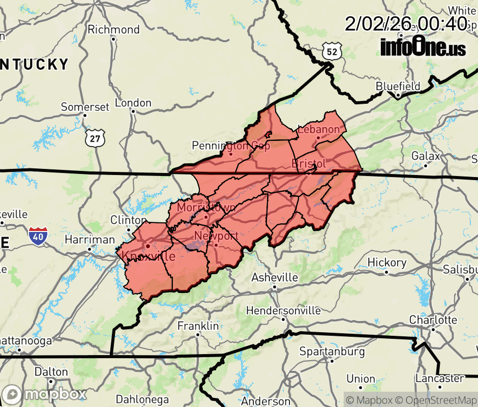 Cold Weather Advisory issued February 2 at 12:39AM EST until February 2 at 9:00AM EST by NWS Morristown TN * WHAT... Very cold temperatures near zero to 5 below zero. Isolated colder readings possible in sheltered valleys. * WHERE... Portions of east Tennessee and southwest Virginia. * WHEN... Until 9 AM EST this morning. * IMPACTS... Frostbite and hypothermia will occur if unprotected skin is exposed to these temperatures. Very cold temperatures can lead to hypothermia with prolonged exposure. ![]() |