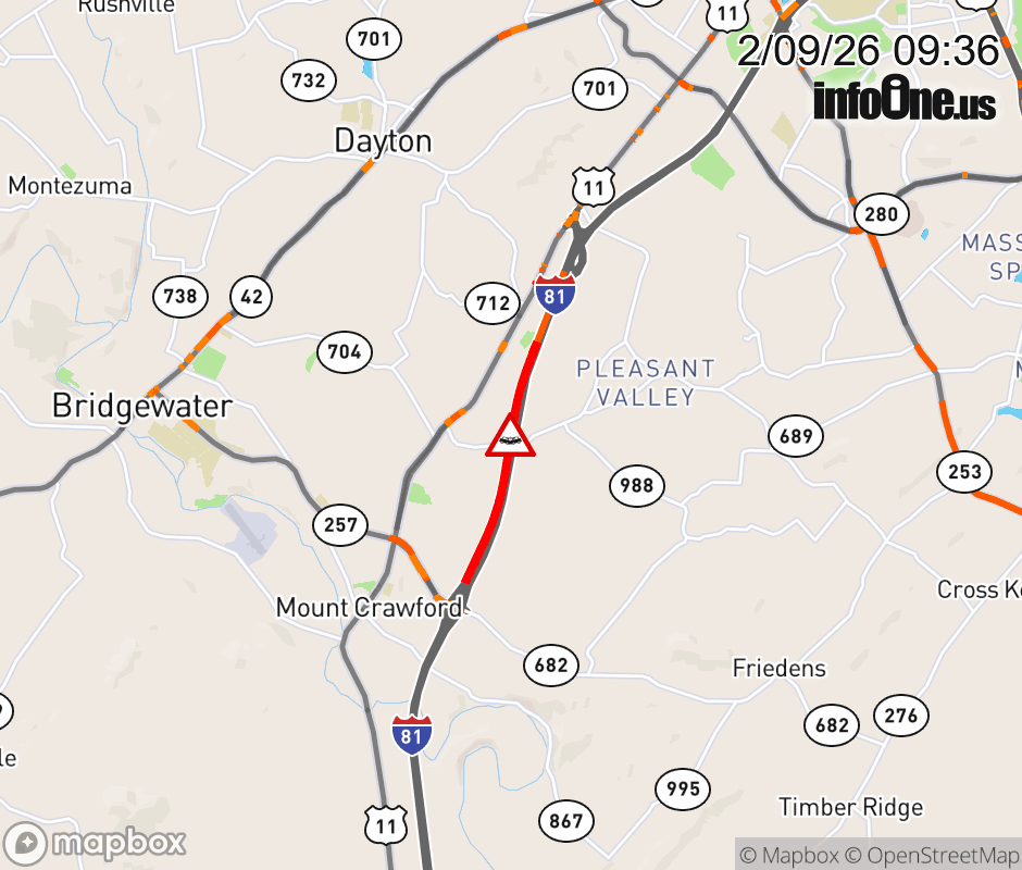 On I-81 at mile marker 241.6 in the County of Rockingham, motorists can expect delays due to a vehicle crash. The south left shoulder and left lane are closed. Traffic backups are approximately 1.5 miles. Updated: Mon 2/9/26 9:36 AM EST ![]() Updated: Mon 2/9/26 9:36 AM EST |
