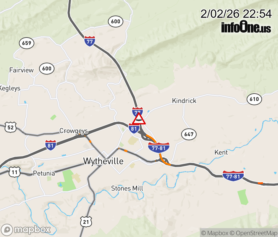 On I-77 at mile marker 41.8 in the County of Wythe, motorists can expect delays due to a tractor trailer crash. The north right shoulder is closed. Updated: Mon 2/2/26 10:54 PM EST ![]() Updated: Mon 2/2/26 10:54 PM EST |