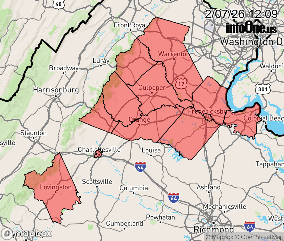 Canceled 2/7/26 6:27 PM Cold Weather Advisory issued February 7 at 12:07PM EST until February 8 at 10:00AM EST by NWS Baltimore MD/Washington DC * WHAT... For the Cold Weather Advisory, very cold wind chills as low as 5 below. For the Wind Advisory, northwest winds 20 to 30 mph with gusts of 45 to 55 mph. * WHERE... Portions of central, northern, and northwest Virginia. * WHEN... For the Cold Weather Advisory, until 10 AM EST Sunday. For the Wind Advisory, until 7 PM EST this evening. * IMPACTS... Gusty winds will blow around unsecured objects. Tree limbs could be blown down and a few power outages may result. * ADDITIONAL DETAILS... Wind chills are expected to remain below zero through late Sunday morning. Being outdoors for a prolonged period of time will be life-threatening. ![]() |