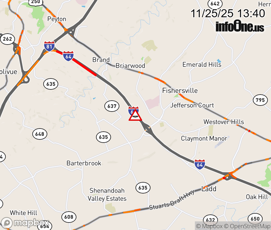 On I-64 at mile marker 91 in the County of Augusta, motorists can expect delays due to a vehicle crash. The east exit ramp narrows. Traffic backups are approximately 1.0 mile. Updated: Tue 11/25/25 1:40 PM EST ![]() Updated: Tue 11/25/25 1:40 PM EST |