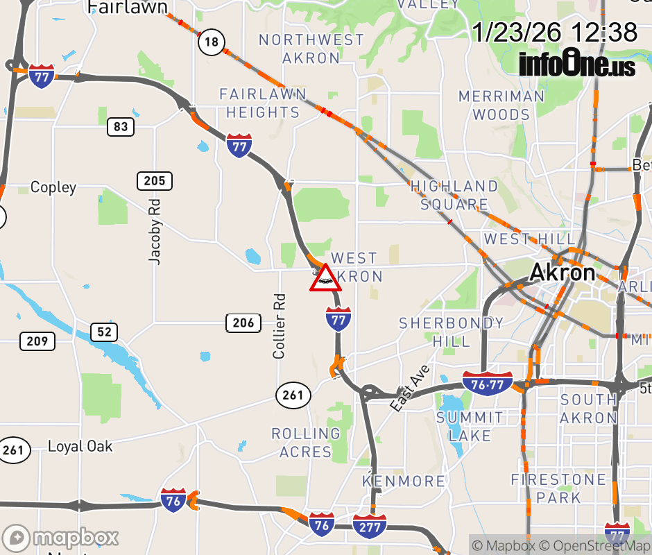 The 2 left lanes are blocked on I-77 North at SR-162/Copley Rd, due to a crash. Updated: Fri 1/23/26 12:38 PM EST ![]() Updated: Fri 1/23/26 12:38 PM EST |