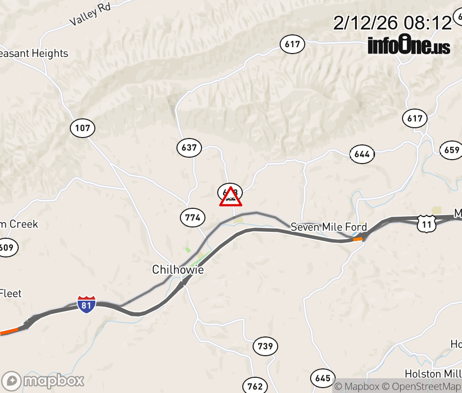 On Rt. 638 in the County of Smyth, in the vicinity of Riley Dr; Rt. 1040N/S (Smyth County), motorists can expect delays due to a disabled tractor trailer. All north lanes are closed. All south lanes are closed. Updated: Thu 2/12/26 8:12 AM EST ![]() Updated: Thu 2/12/26 8:12 AM EST |