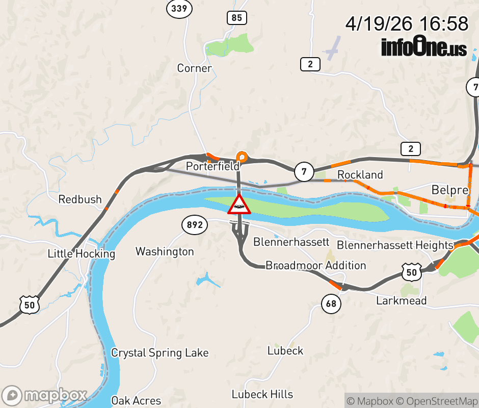 Vehicle Crash on US-50 (Robert Byrd Hwy) - Westbound - Blennerhassett Island Bridge in Washington. ![]() |