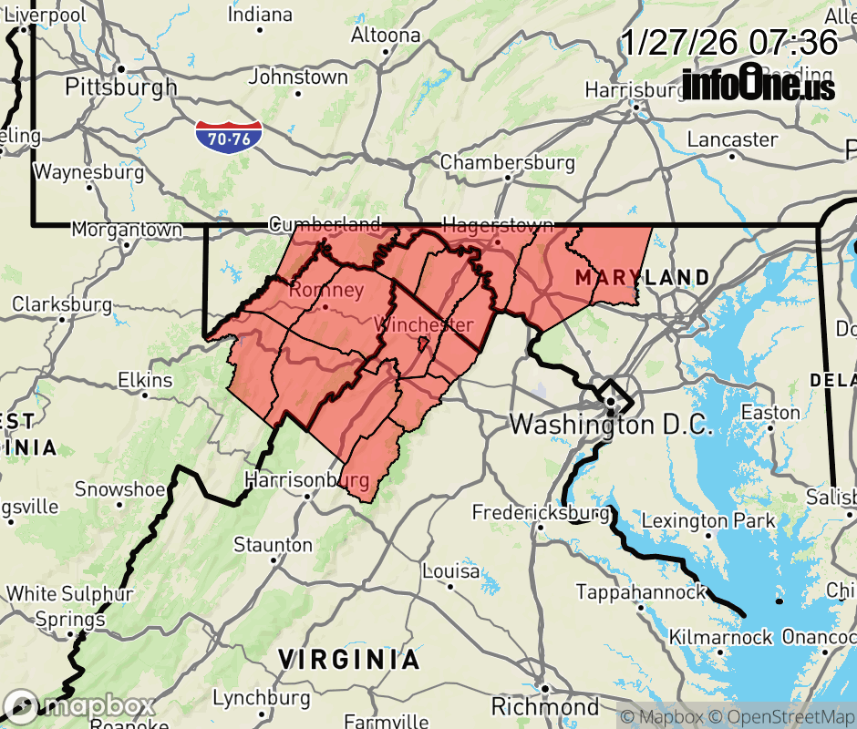 Canceled 1/27/26 11:00 AM Cold Weather Advisory issued January 27 at 7:35AM EST until January 27 at 11:00AM EST by NWS Baltimore MD/Washington DC * WHAT... For the first Cold Weather Advisory, very cold wind chills as low as 15 below zero. For the second Cold Weather Advisory, very cold wind chills as low as 10 below zero expected. * WHERE... Portions of north central and western Maryland, northwest Virginia, and eastern and panhandle West Virginia. * WHEN... For the first Cold Weather Advisory, until 11 AM EST this morning. For the second Cold Weather Advisory, from 7 PM this evening to 11 AM EST Wednesday. * IMPACTS... The dangerously cold wind chills as low as 15 to 18 below zero could result in hypothermia or frostbite if precautions are not taken. Frostbite and hypothermia will occur if unprotected skin is exposed to these temperatures. Wind chill values can lead to hypothermia with prolonged exposure. * ADDITIONAL DETAILS... Additional Cold Weather Headlines are expected at times through the end of the week as the region remains in an Arctic Airmass. ![]() |
