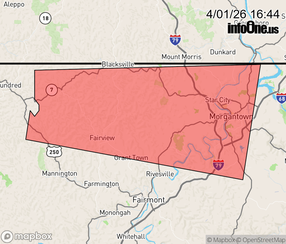 Canceled 4/1/26 4:57 PM Severe Thunderstorm Warning issued April 1 at 4:43PM EDT until April 1 at 5:30PM EDT by NWS Pittsburgh PA SVRPBZ The National Weather Service in Pittsburgh has issued a * Severe Thunderstorm Warning for... Northern Marion County in northern West Virginia... Monongalia County in northern West Virginia... * Until 530 PM EDT. * At 443 PM EDT, a severe thunderstorm was located 5 miles northwest of Fairview, or 8 miles north of Mannington, moving east at 30 mph. HAZARD...60 mph wind gusts and quarter size hail. SOURCE...Radar indicated. IMPACT...Hail damage to vehicles is expected. Expect wind damage to roofs, siding, and trees. * Locations impacted include... Morgantown, Westover, Star City, Granville, Fairview, Cassville, Grant Town, McCurdyville, Core, Crown, Georgetown, Pentress, Daybrook, Everettville, Booth, Osage, Wana and Wadestown. ![]() |
