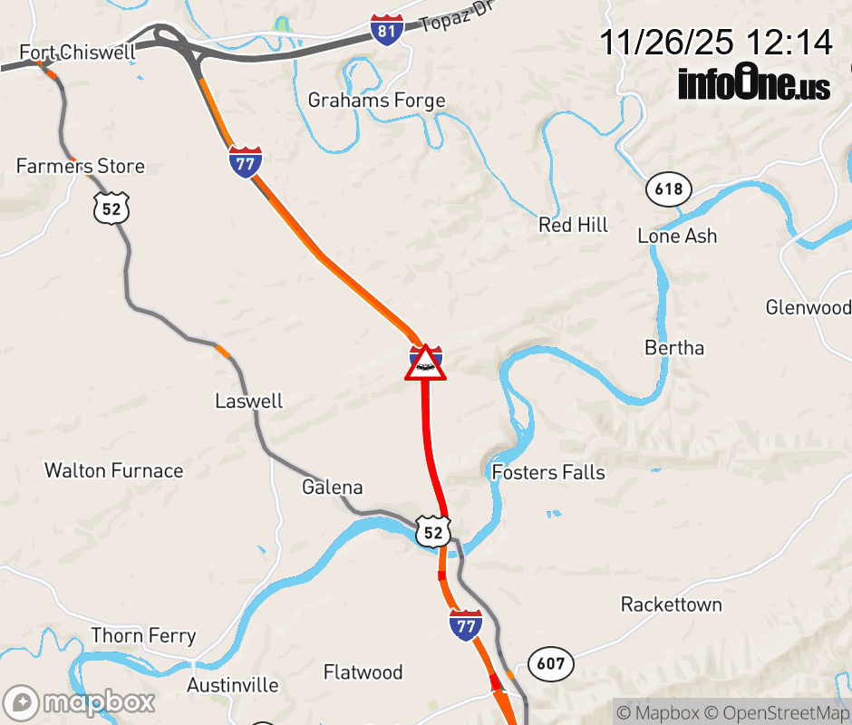 On I-77 at mile marker 27.9 in the County of Wythe, motorists can expect delays due to a multi-vehicle crash. The north left shoulder and left lane are closed. Updated: Wed 11/26/25 12:14 PM EST ![]() |