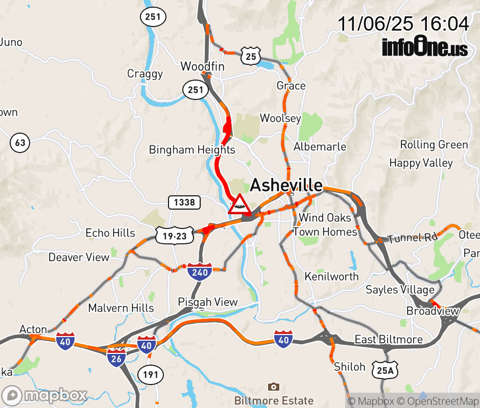 The right lane is closed 2 miles prior to Exit 25, NC 251 (Riverside Drive). ![]() |