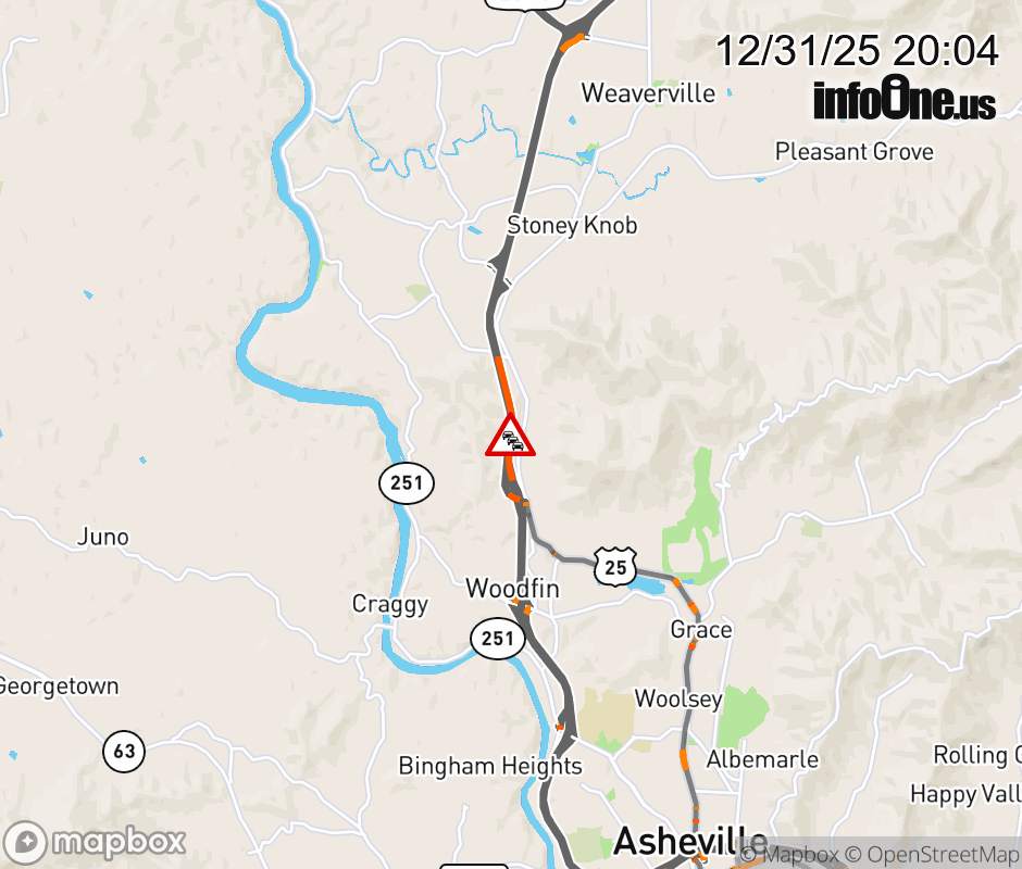 The right shoulder is closed half a mile west of Exit 23, US 25 (Weaverville Road). Updated: Wed 12/31/25 8:04 PM EST ![]() Updated: Wed 12/31/25 8:04 PM EST |