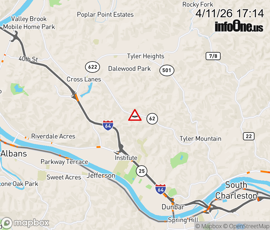 Vehicle Crash on WV-62 (4807 Washington Street) . The northbound road is closed. The southbound road is closed. Updated: Sat 4/11/26 5:14 PM EDT ![]() Updated: Sat 4/11/26 5:14 PM EDT |