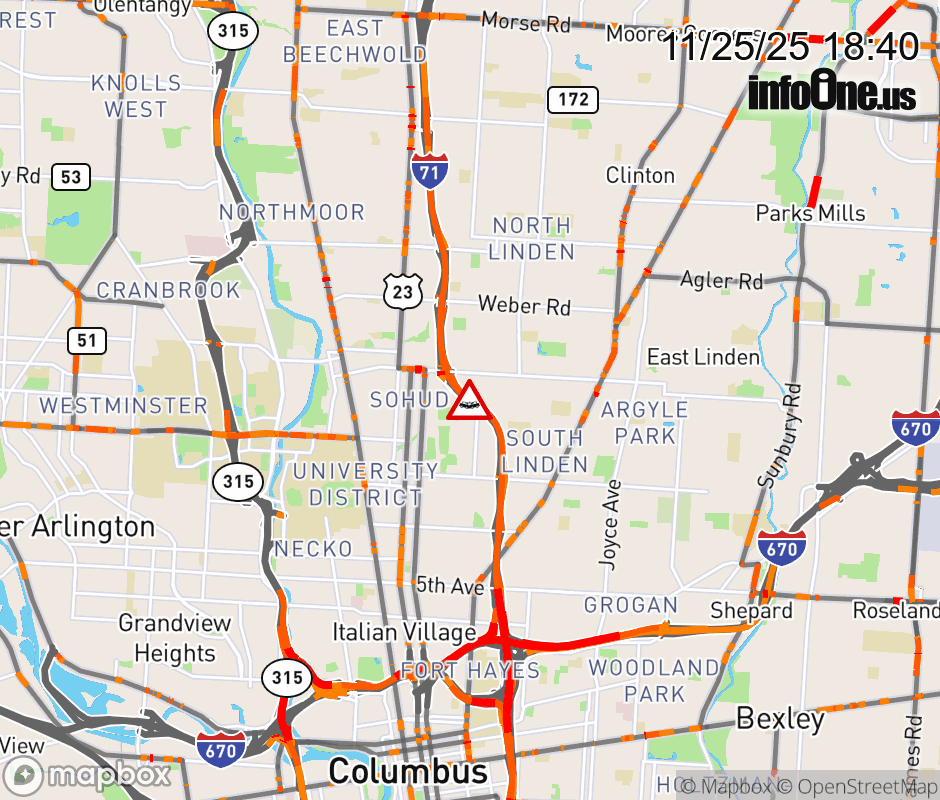 The left lane is blocked on I-71 North at Hudson St, due to a crash. Updated: Tue 11/25/25 6:40 PM EST ![]() Updated: Tue 11/25/25 6:40 PM EST |