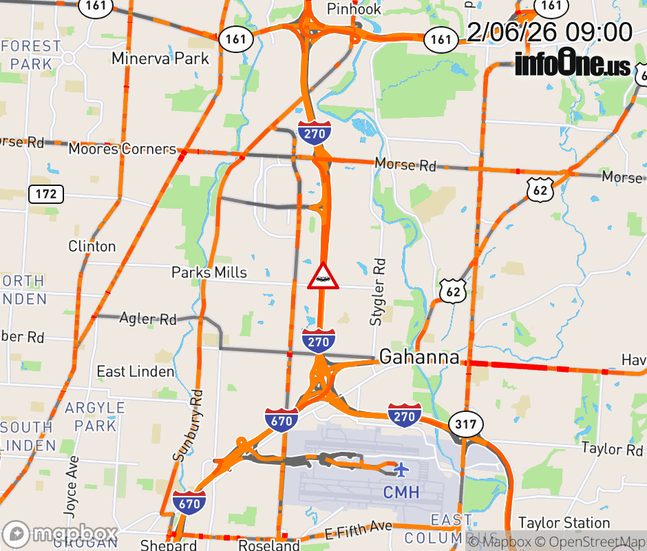 The 2 left lanes are blocked on I-270 North beyond US-62 East/Johnstown Rd, due to a crash. Updated: Fri 2/6/26 9:00 AM EST ![]() Updated: Fri 2/6/26 9:00 AM EST |