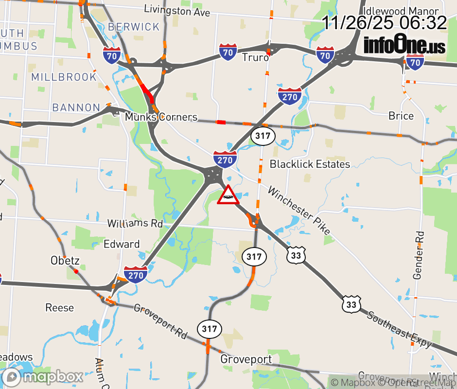 The left lane is blocked on US-33 East beyond I-270 North, due to a crash. ![]() |