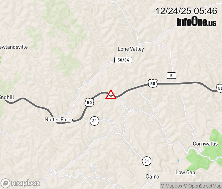 Vehicle Crash on US-50 Between CR-31/1 (Nutters Fork Rd) and CR-50/4 (Alkire Hill Rd). Updated: Wed 12/24/25 5:46 AM EST ![]() Updated: Wed 12/24/25 5:46 AM EST |