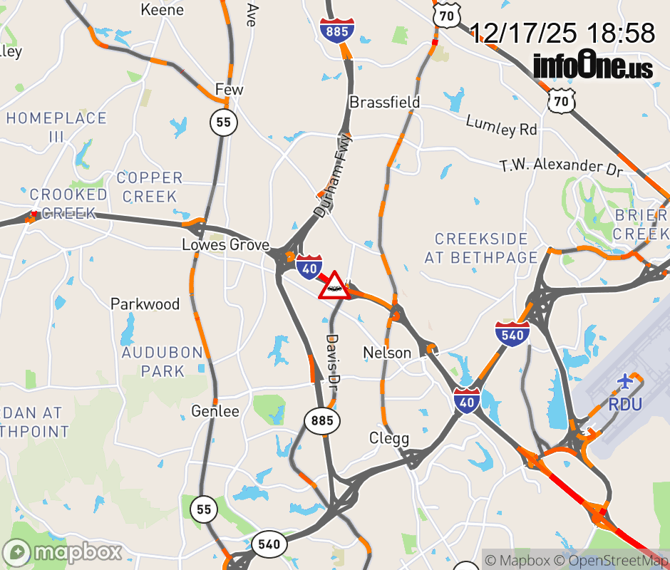 The right shoulder is closed past Exit 280 (Davis Dr). Updated: Wed 12/17/25 6:58 PM EST ![]() Updated: Wed 12/17/25 6:58 PM EST |