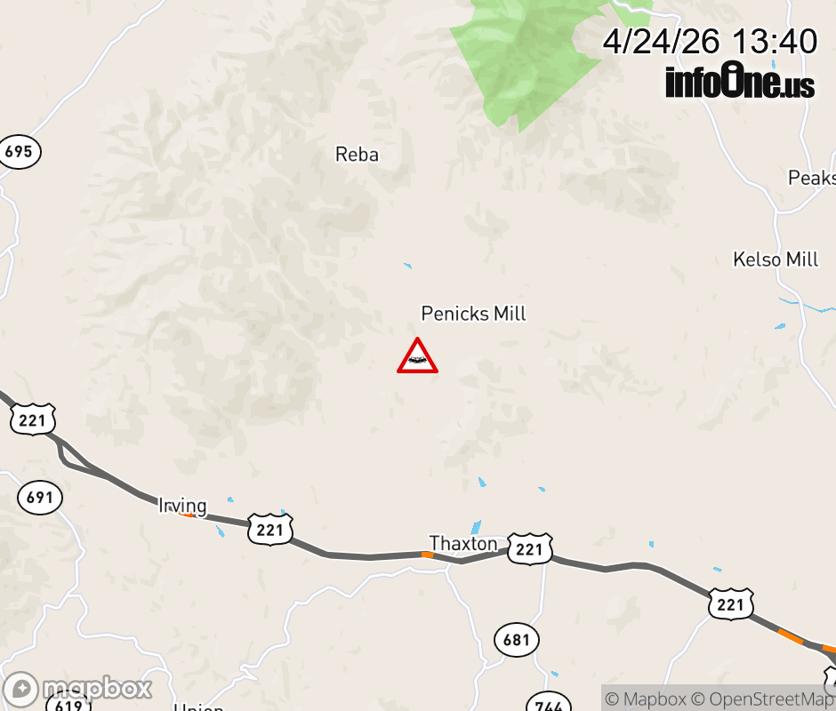 On Rt. 688 East in the County of Bedford, in the vicinity of Amos Ln; Bee Dr; Bordelon Dr; Cool Springs Rd; Riddle Ave; Taylor Mountain Rd; Rt. 686E/W (Bedford County), motorists can expect delays due to a vehicle crash. Lane closures exist. Updated: Fri 4/24/26 1:40 PM EDT ![]() Updated: Fri 4/24/26 1:40 PM EDT |