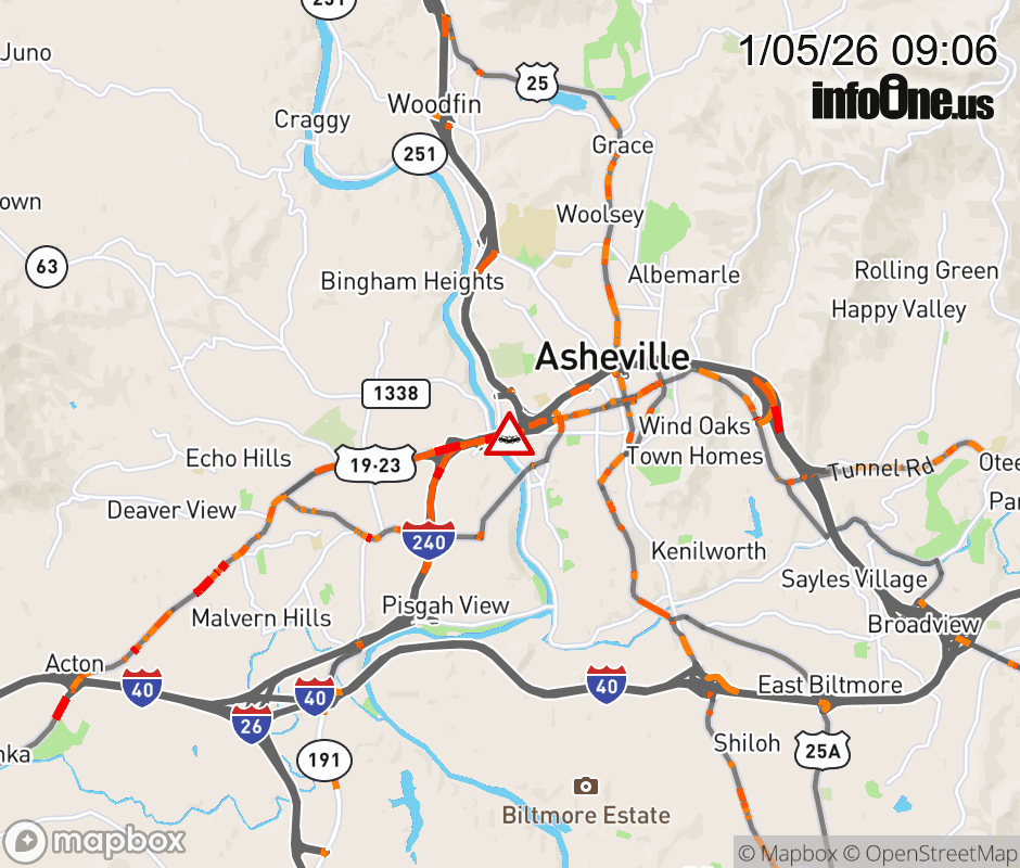 The right shoulder is closed before Exit 4b, Patton Avenue. Updated: Mon 1/5/26 9:06 AM EST ![]() Updated: Mon 1/5/26 9:06 AM EST |