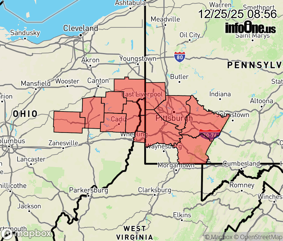 Canceled 12/25/25 11:00 AM Special Weather Statement issued December 25 at 8:55AM EST by NWS Pittsburgh PA Patchy fog has developed this morning and has reduced visibility to one mile or less at times. Motorists are urged to slow down, increase following distance, and be prepared for changes in visibility along their route. ![]() |