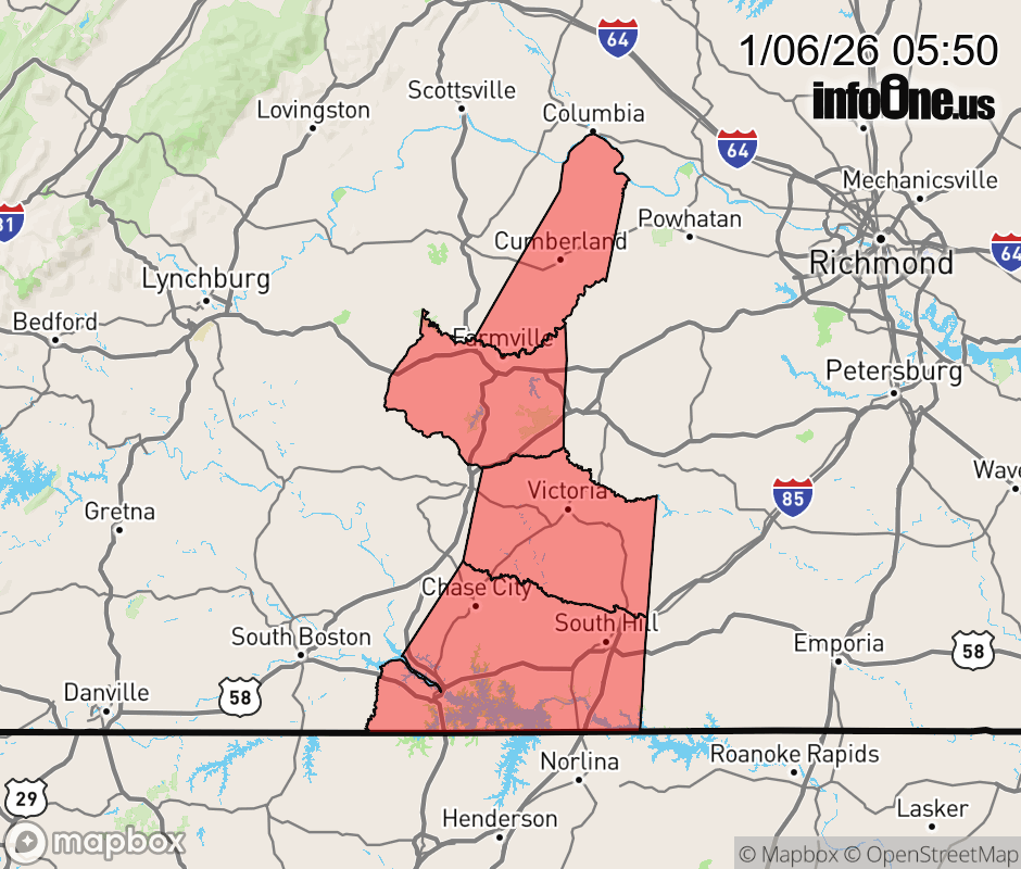 Canceled 1/6/26 8:00 AM Special Weather Statement issued January 6 at 5:45AM EST by NWS Wakefield VA Areas of locally dense fog have developed across the Eastern Virginia Piedmont early this morning, primarily along a corridor from Cumberland, to Farmville, to Chase City, and Clarksville. Visibility will generally be reduced to one half to one mile, but will locally be reduced to a quarter mile or less. The fog should lift by 9 AM. Motorists should be alert for sudden changes in visibility due to the areas of dense fog. Drive at reduced speeds, watch for children at school bus stops, and use low beam headlights only. ![]() |