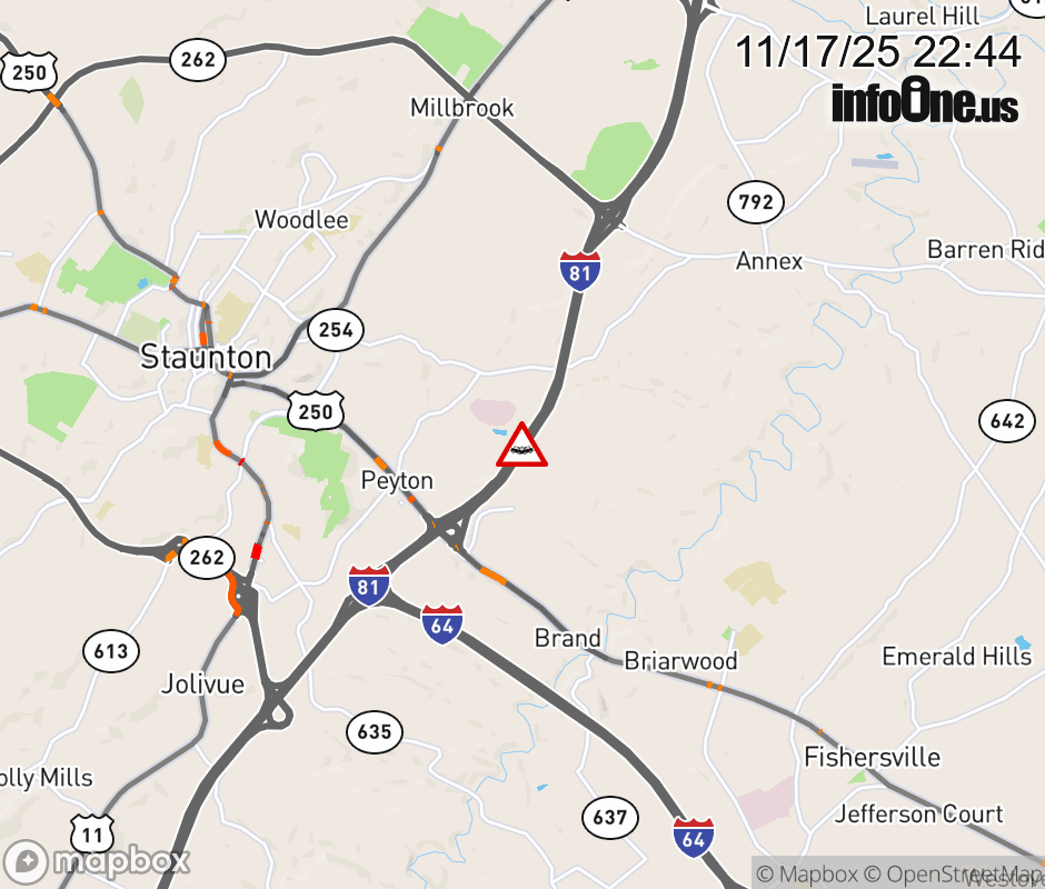 On I-81 at mile marker 223.6 in the County of Augusta, motorists can expect delays due to a vehicle crash. The south right lane and right shoulder are closed. Updated: Mon 11/17/25 10:44 PM EST ![]() |
