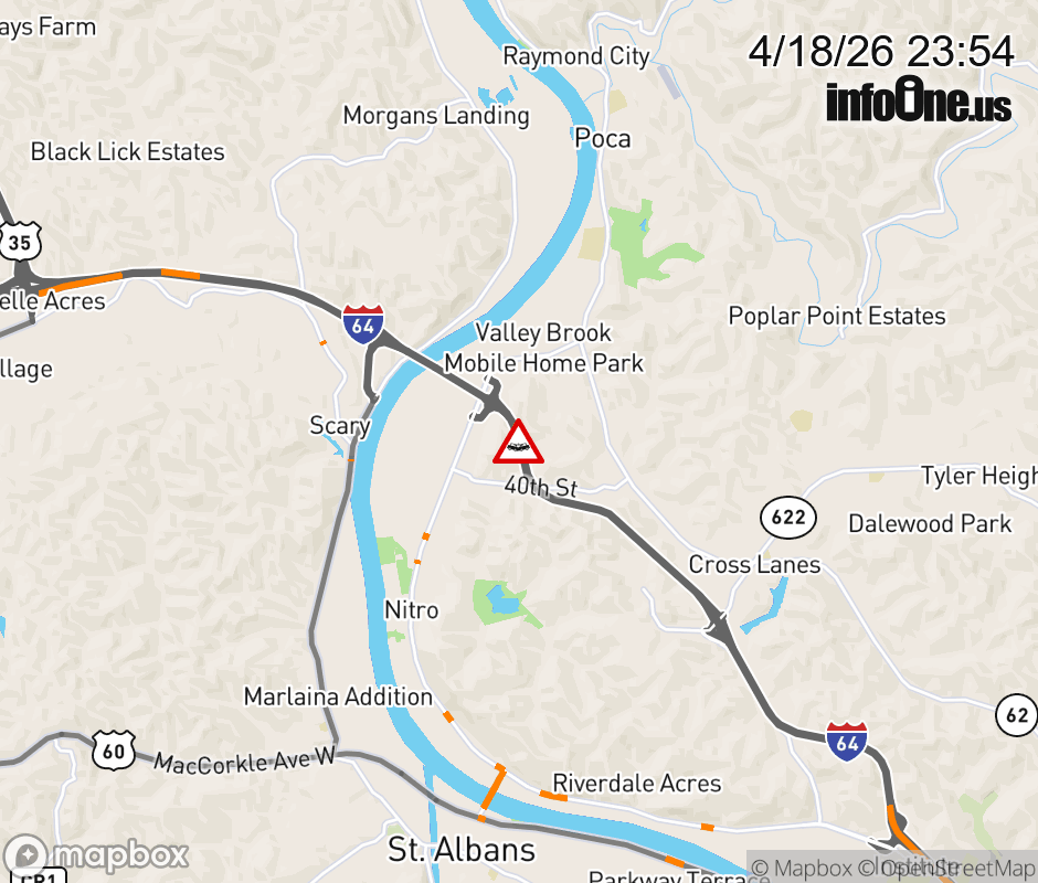 Vehicle Crash on I-64E at Mile Marker 45.0. The eastbound right lane is closed. Updated: Sat 4/18/26 11:54 PM EDT ![]() Updated: Sat 4/18/26 11:54 PM EDT |