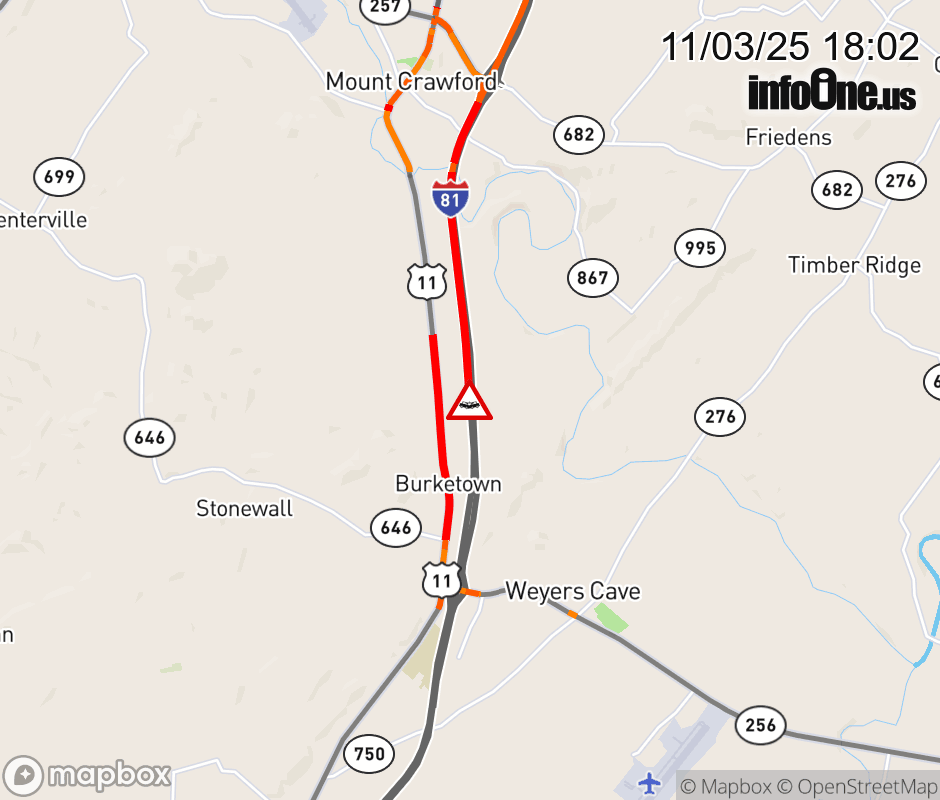 On I-81 South at mile marker 237 in the County of Rockingham, motorists can expect delays due to a tractor trailer crash. Traffic backups are approximately 5.0 miles. Updated: Mon 11/3/25 6:02 PM EST ![]() Updated: Mon 11/3/25 6:02 PM EST |
