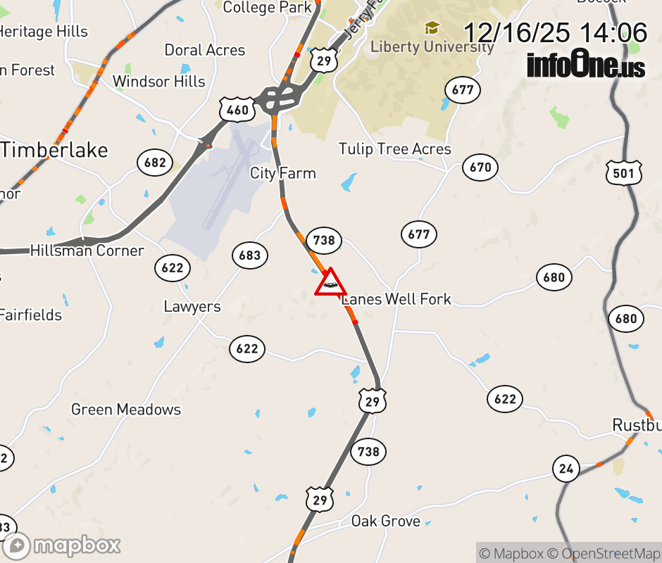 On US-29 in the County of Campbell, in the vicinity of Industrial Cir; Wetbanks Dr, motorists can expect delays due to a multi-vehicle crash. The north right lane and right shoulder are closed. Updated: Tue 12/16/25 2:06 PM EST ![]() Updated: Tue 12/16/25 2:06 PM EST |