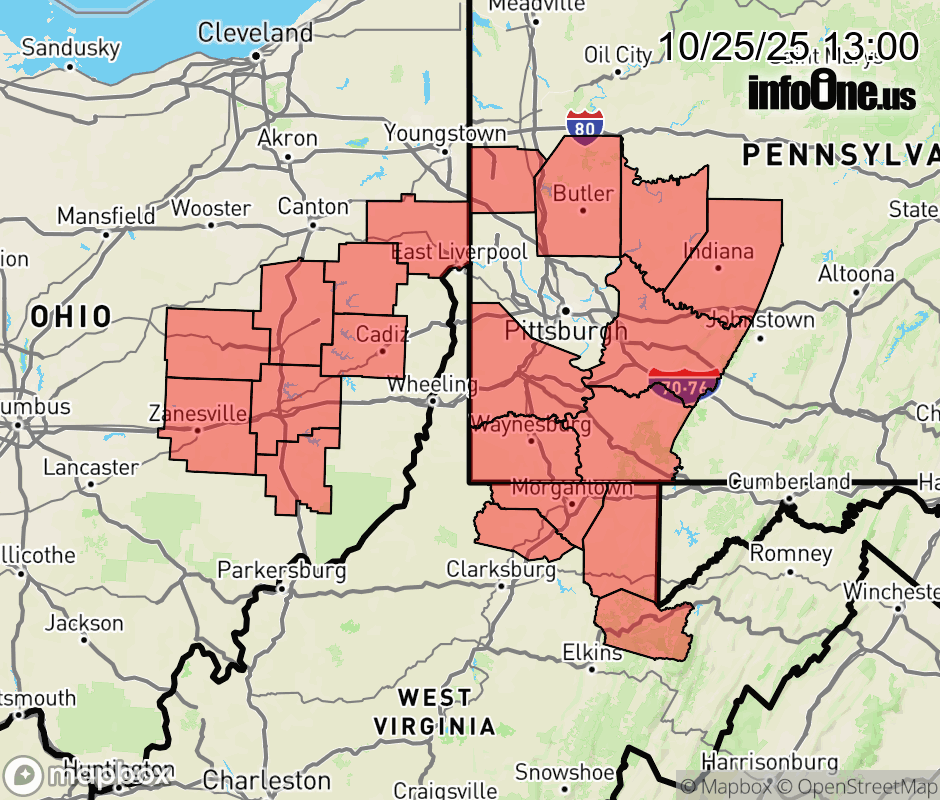 Canceled 10/25/25 7:56 PM Freeze Warning issued October 25 at 12:58PM EDT until October 26 at 9:00AM EDT by NWS Pittsburgh PA * WHAT... Sub-freezing temperatures as low as 29 expected. * WHERE... Portions of east central Ohio, southwest and western Pennsylvania, and northern West Virginia. * WHEN... From midnight tonight to 9 AM EDT Sunday. * IMPACTS... Frost and freeze conditions could kill crops, other sensitive vegetation and possibly damage unprotected outdoor plumbing. ![]() |
