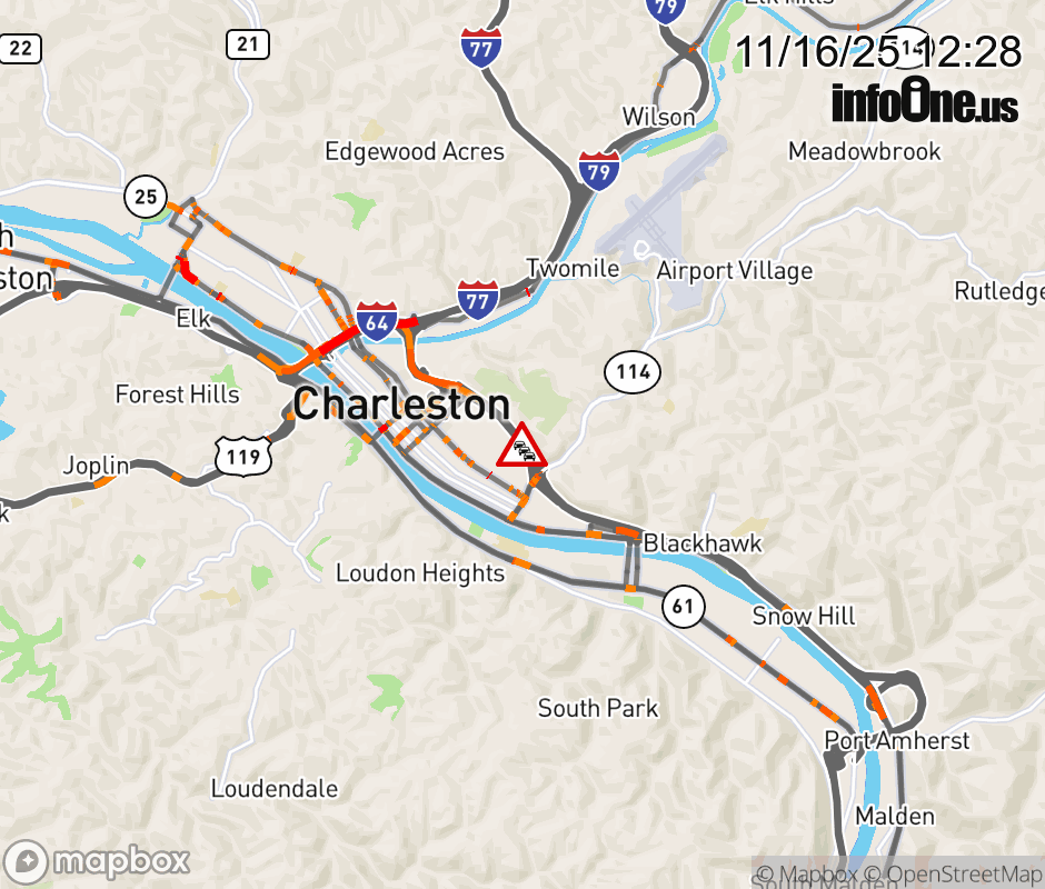 Congestion-Delay on I-77N at Mile Marker 99.5. Comments:Due to Roadwork on I-64 Westbound at MM 58 (Eugene A. Carter Memorial Bridge) - Center and Right Lanes are Closed. Updated: Sun 11/16/25 12:28 PM EST ![]() Updated: Sun 11/16/25 12:28 PM EST |
